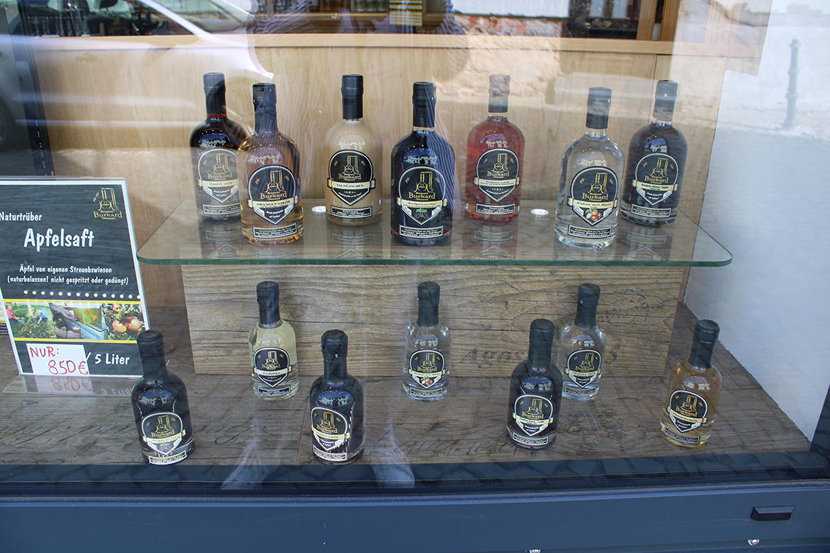 Oberurseler Obstbrände und Liköre wie Mirabellenwasser, Apfelbrand, Obstwasser, Aufgesetzter, Kakao mit Nuss und vieles mehr, alles aus eigener Herstellung. Lohnbrennerei: die Obstbrennerei Burkard brennt das Obst ihrer Kunden. Gin-Tastings auf Anfrage ab 5 Personen.