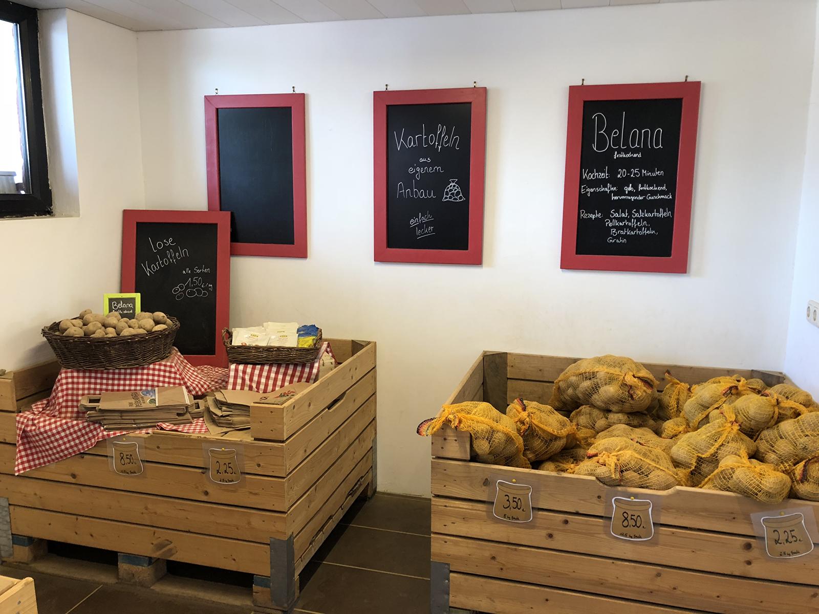 Eier aus Bodenhaltung, Geflügel und selbstgemachte Hühnerbrühe, Hausmacher Wurst und Fleisch von eigenen Schweinen. Erdbeeren (auch zum Selbstpflücken), Himbeeren, Tafeläpfel, Johannisbeeren, Kartoffeln und Kürbisse aus kontrolliertem Anbau. Selbst hergestellte Marmelade aus eigenen Früchten. Von festkochend bis mehlig findet man die richtige Kartoffelsorte: Festkochend sind Annabelle (früh, August / September) sowie Glorietta und Belana (nahezu ganzjährig verfügbar). Vorwiegend festkochend bis mehlig: Marabel und Concordia (Herbst bis Frühjahr).